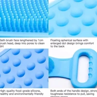 - The silicone shower body scrubber extends 1cm dense brush head, penetrates into pores to clean dirt, and freshens. The silicone back scrub is not too coarse to irritate sensitive skin and it ensures anti-slip and comfortable grip allowing you to massage and clean your back and other hard-to-reach body areas with ease.
